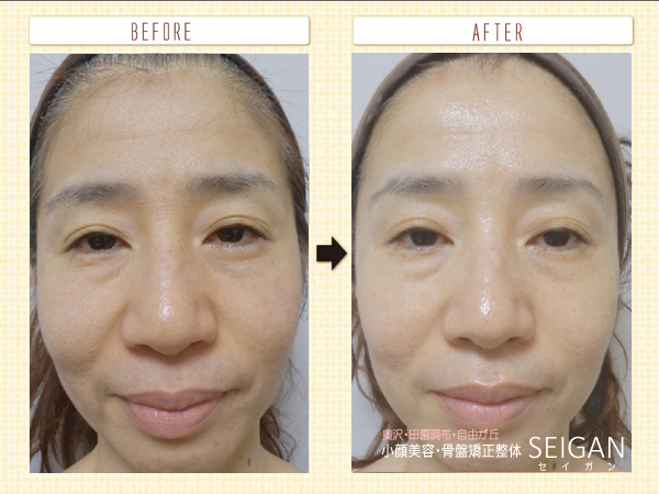 ご丁寧な感想を有難く拝見しました。お肌はとてもなめらかで、きちんとしたケアをしていけば早い段階でお悩みは改善していくのでは?と思いました。頬の高さが変わり、1回でもずいぶんお若くなられた印象でした。